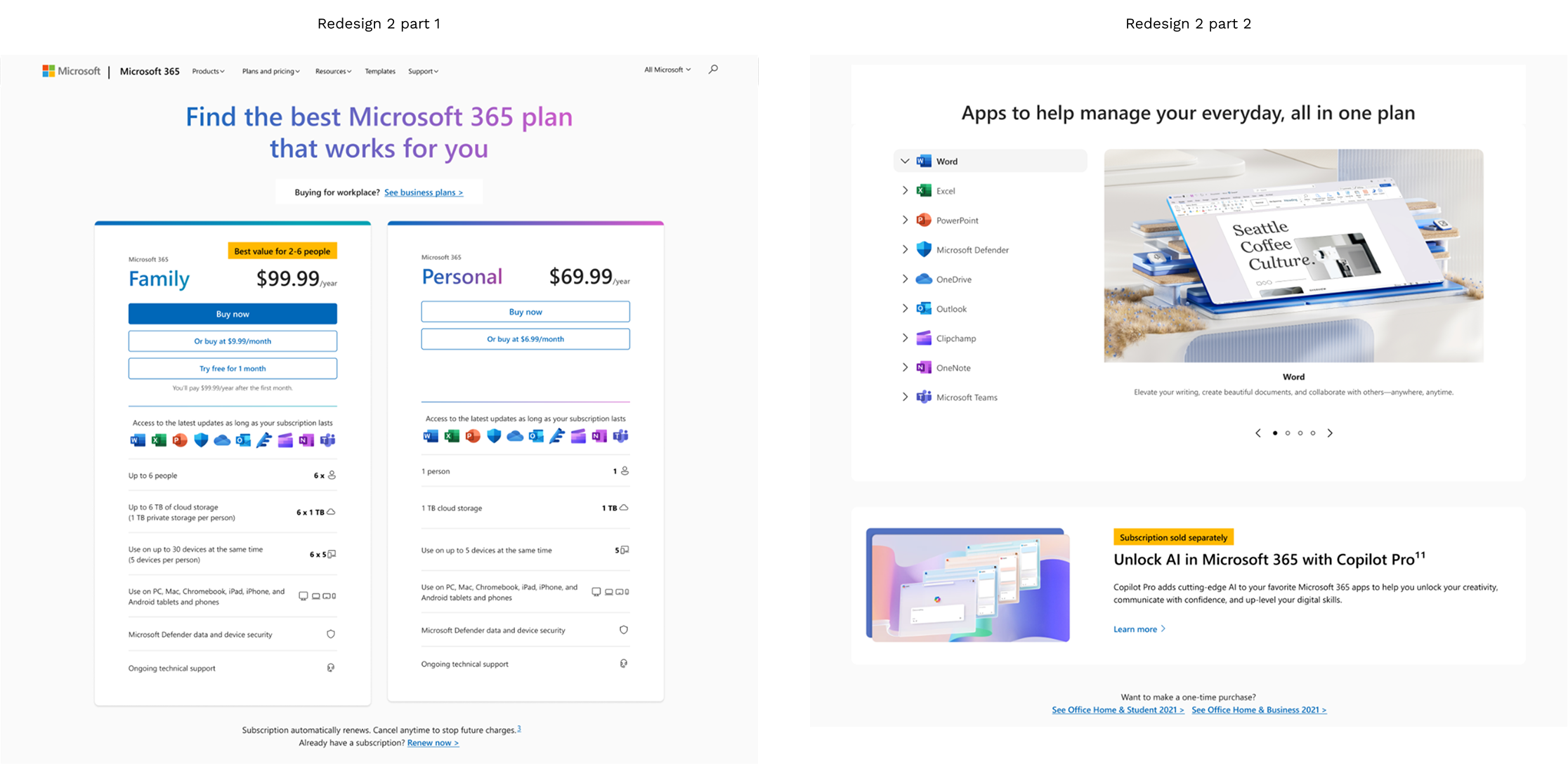 I collaborated closely with researchers and stakeholders from Marketing, Design System and Plans teams to redesign the M365 marketing page. My role focused on bringing clarity, structure, and visual polish to the experience, ensuring the designs are aligned with evolving product messaging while supporting user needs and business goals. The redesign was informed by experiments and user insights, and aimed to create a more engaging and conversion-driven first impression.