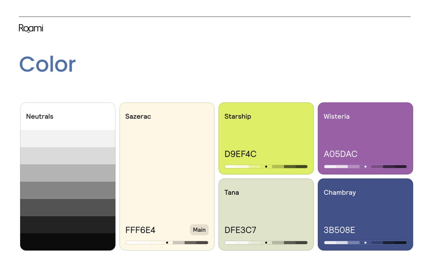 The Roami color palette is built around Sazerac as the primary foundation, chosen for its open quality that gives the interface room to breathe and keeps the experience unobtrusive. Starship and Tana provides an emotional counterweight. It’s energetic and aspirational: the “light on the road ahead.” Wisteria and Chambray add depth through accent states, icons, and interface gradients, helps draw attention to key product moments and details, creating visual focus without being overwhelming.