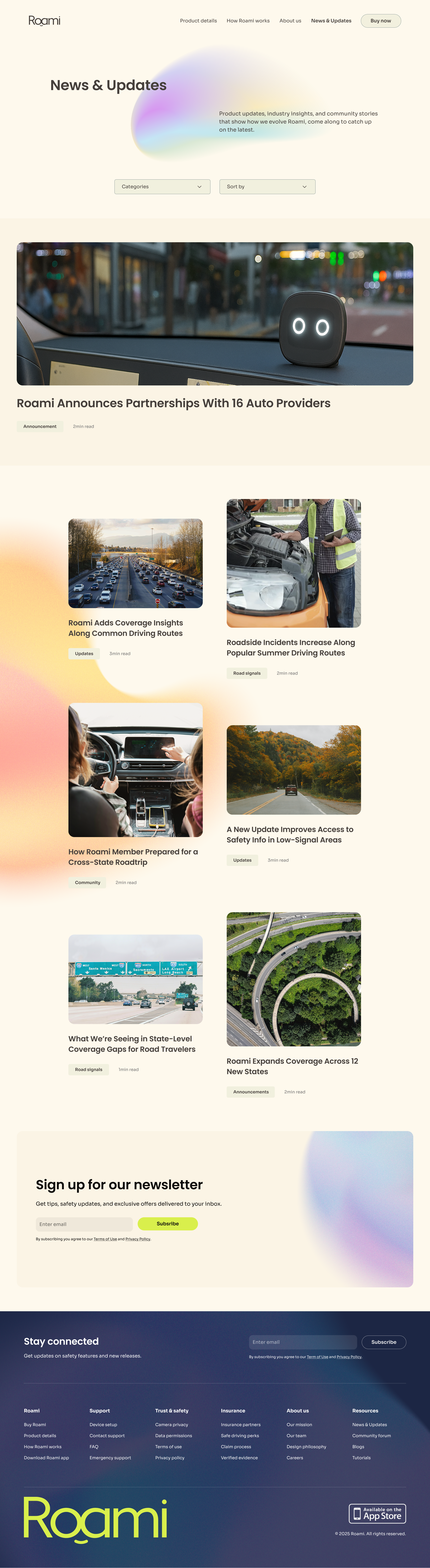This page was designed as an editorial hub that supports Roami’s evolving product and brand. It brings together product updates, road-level insights, and community stories in a scannable layout. This page reinforces trust by showing how Roami evolves and adapts.