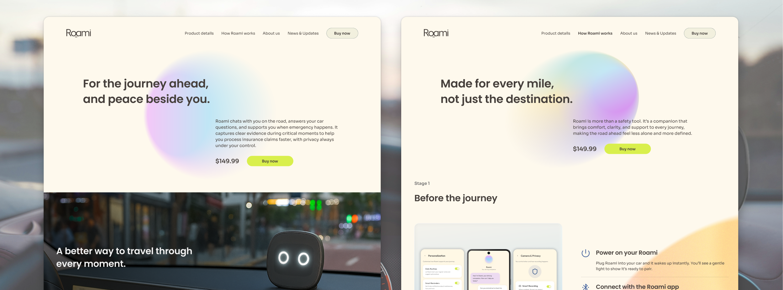 The opening hero on all pages establish the presence of Roami. Throughout the page, the soft ambient gradients and glass textured cards echo the visual sensation of headlights through fog or dusk reflections on car windows. The gradients also reflect the passage of time, as they get deeper when the page goes on.