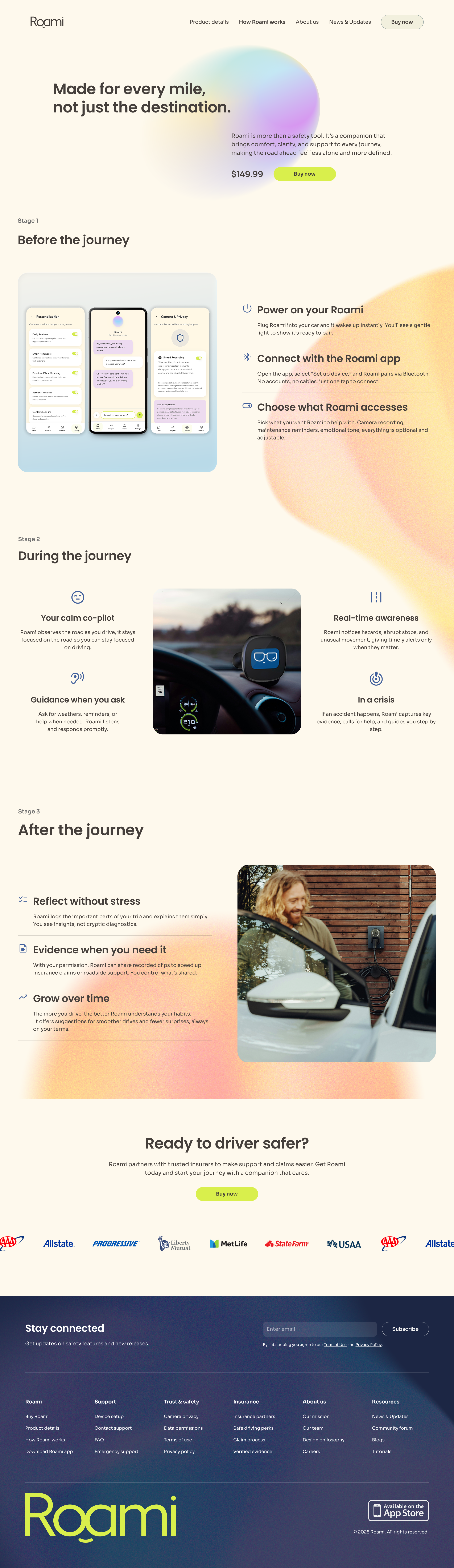 This page explains Roami’s behavior at the moments a driver would care: before the journey, during the journey, and after the journey, emphasizing reassurance, clarity, and continuity.